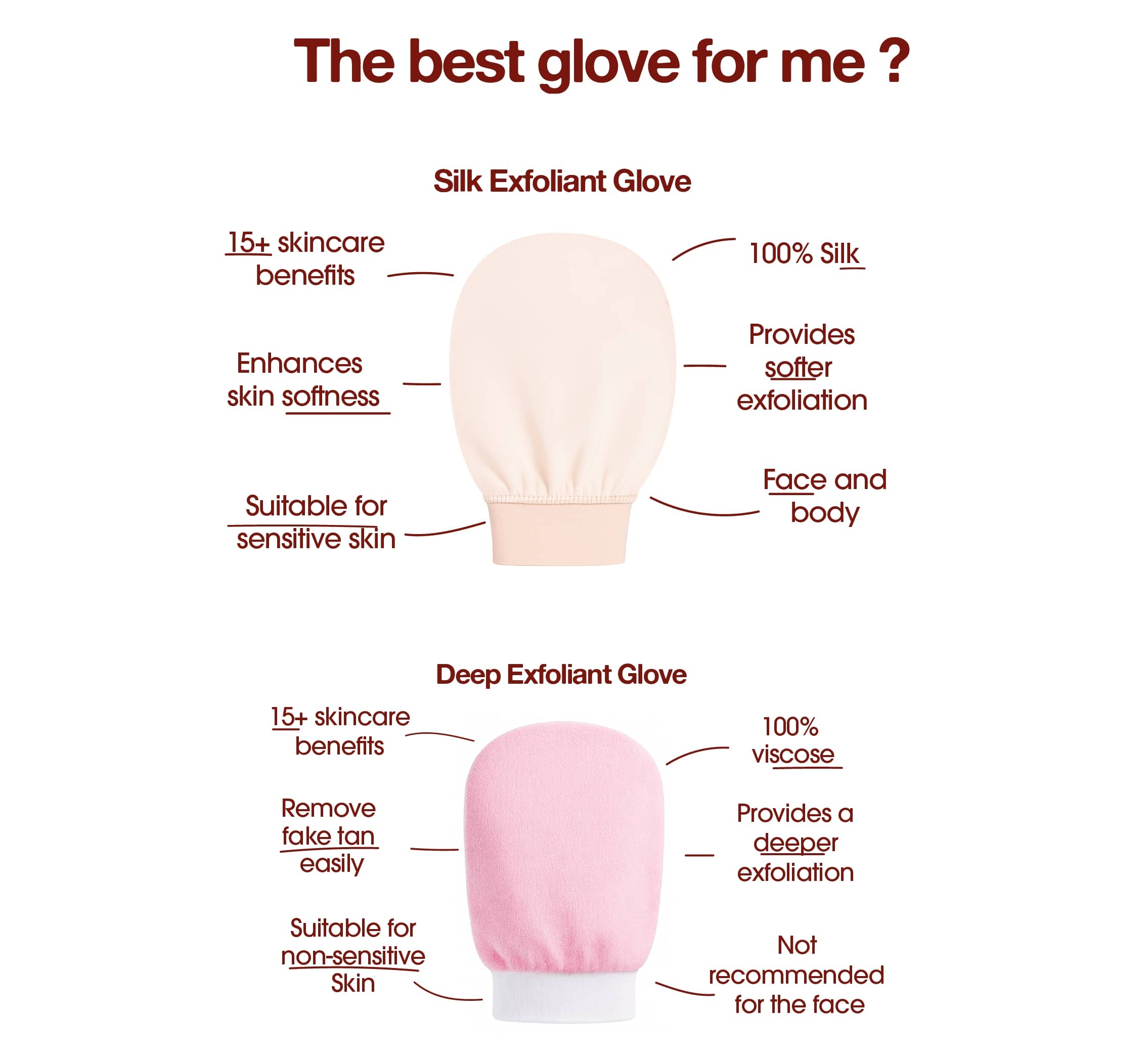 The Silk exfoliant glove, being made of natural silk, allow for gentle exfoliation and are therefore suitable for even the most sensitive skin ! If u have sensitive Skin prefer the silk and the Deep Exfoliant Glove can be used on thicker areas of the body (back, elbows, knees).
